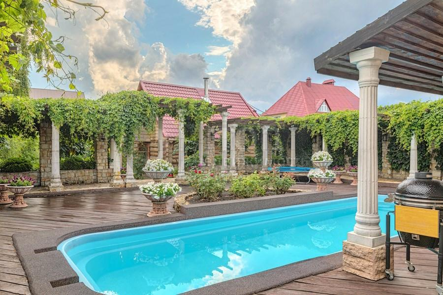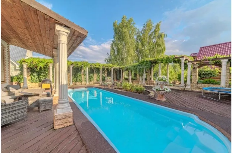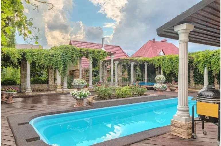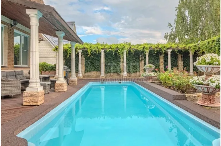 БОЛЬШОЙ РОВНЫЙ УЧАСТОК, ПОЛНОСТЬЮ БЛАГОУСТРОЕН! Со всех сторон ОГОРОЖЕН ЗАБОРОМ! С лицевой стороны НАВЕС для стоянки ТРЁХ АВТО! ШИРОКИЕ дорожки выложены ТРОТУАРНОЙ ПЛИТКОЙ и КАМНЕМ, ОСВЕЩЕНИЕ, ЗЕЛЁНЫЕ ГАЗОНЫ, деревья и дорогие ДЕКОРАТИВНЫЕ насаждения! Помимо коттеджа, на участке находится ОТДЕЛЬНЫЙ ГОСТЕВОЙ ДОМ со всеми коммуникациями, с БАНЕЙ и РУССКОЙ ПЕЧЬЮ, большой застеклённой ВЕРАНДОЙ с ПЕЧЬЮ/МАНГАЛОМ! А также ДЕТСКАЯ ПЛОЩАДКА с безопасным покрытием и ДВА больших плавательных БАССЕЙНА!