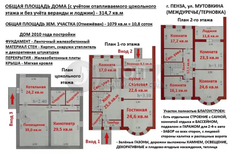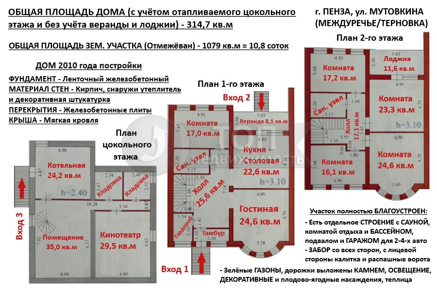 ПРОСТОРНАЯ и ПРОДУМАННАЯ ПЛАНИРОВКА, в которой есть ВСЁ необходимое, и ничего лишнего! Два ПОЛНОЦЕННЫХ жилых этажа с ВЫСОКИМИ потолками – 3,1 МЕТРА! Шесть ПРОСТОРНЫХ комнат, кухня-столовая с выходом на веранду и во двор, большой холл и два сан. узла! А также отапливаемый ЦОКОЛЬНЫЙ этаж с КИНОТЕАТРОМ, подсобными помещениями и котельной с дополнительным выходом во двор!
