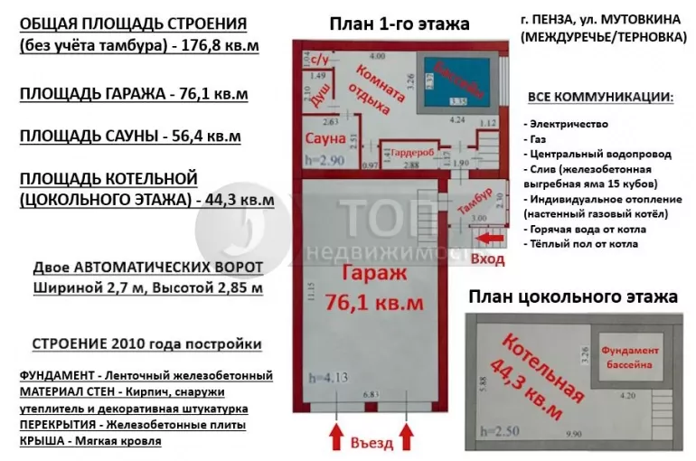 БОЛЬШОЙ РОВНЫЙ ШИРОКИЙ УЧАСТОК, ПОЛНОСТЬЮ БЛАГОУСТРОЕН! Со всех сторон ОГОРОЖЕН ЗАБОРОМ! Участок УГЛОВОЙ – то есть соседи только с ДВУХ сторон! С лицевой стороны площадка для стоянки ЧЕТЫРЁХ АВТО, а также БОЛЬШОЙ ГАРАЖ на ДВА-ЧЕТЫРЕ АВТО с двумя автоматическими воротами (высота гаража 4,13 метра, высота ворот 2,85 метра)! ЗЕЛЁНЫЕ ГАЗОНЫ, дорожки выложены КАМНЕМ, ОСВЕЩЕНИЕ, дорогие ДЕКОРАТИВНЫЕ и плодово-ягодные насаждения! Помимо коттеджа, на участке находится ОТДЕЛЬНОЕ СТРОЕНИЕ (Кирпич 2010 года, общей площадью 177 кв.м, с учётом гаража 76 кв.м) с ОТОПЛЕНИЕМ и ВСЕМИ коммуникациями, с ОТДЕЛКОЙ и МЕБЕЛЬЮ, с САУНОЙ, комнатой отдыха и БАССЕЙНОМ!