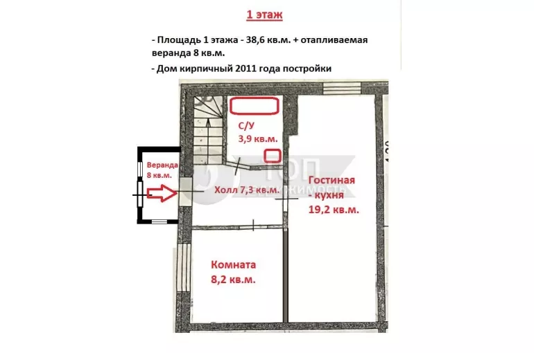 НА ПЕРВОМ ЭТАЖЕ расположена просторная гостиная-кухня 19,2 кв.м., спальная комната 8,2 кв.м. и санузел 3,9 кв.м. Общая площадь первого этажа – 38,6 кв.м. + веранда 8 кв.м.