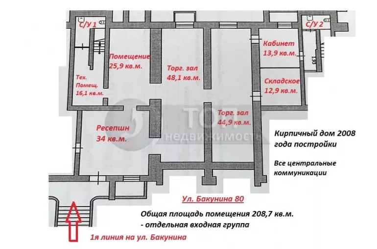 Общая площадь помещения – 208,7 кв.м., планировка включает в себя 3 просторных торговых зала (48,1 + 44,9 + 25,9 кв.м.), кабинет (13,9 кв.м.), подсобное (12,9 кв.м.), техническое (16,1 кв.м.) помещение и 2 санузла. Кроме того, имеется дополнительный (запасной) выход во двор. Пожарная и охранная системы.