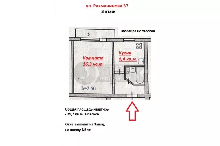 Общая площадь квартиры 29,7 кв.м. + застекленный балкон;