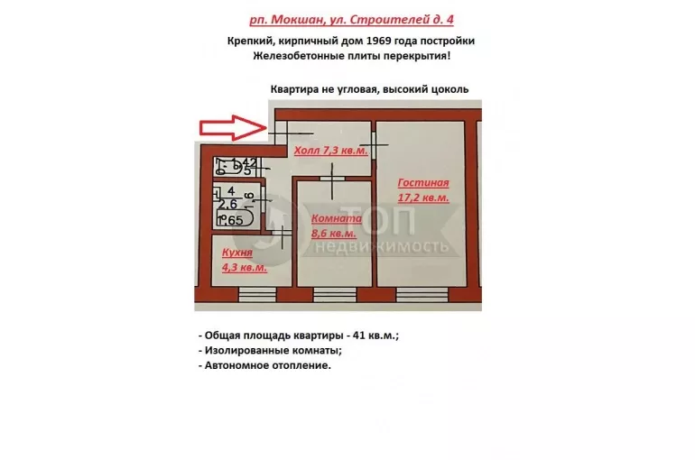 Продается 2к квартира 41 кв.м. в кирпичном доме на ул. Строителей 4 (рп. Мокшан)