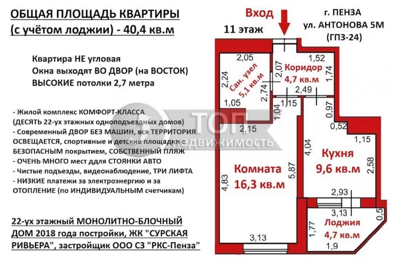 Вся необходимая инфраструктура для комфортного проживания находится в шаговой доступности (магазины, супермаркеты, учреждения здравоохранения, ФОК).