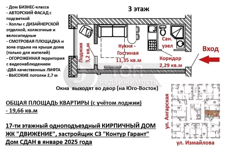 Продаётся КВАРТИРА-СТУДИЯ на 3 этаже, ГПЗ-24, ЖК «Движение», ул. ИЗМАЙЛОВА 46, Дом сдан