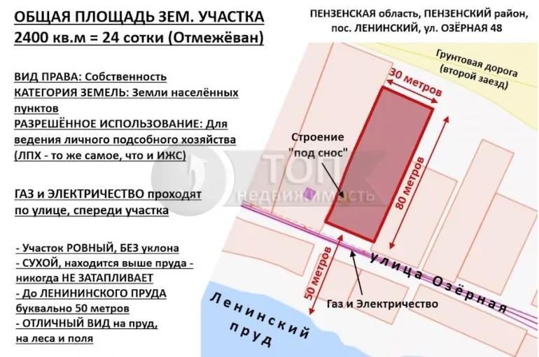 Продается УЧАСТОК 24 сотки рядом с ПРУДОМ, в пос. ЛЕНИНСКИЙ, ул. ОЗЁРНАЯ 48