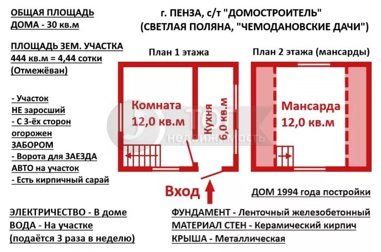 ОБЩАЯ ПЛОЩАДЬ ДОМА: 30,0 кв.м (комната 12,0 кв.м, кухня 6,0 кв.м + мансарда 12,0 кв.м).