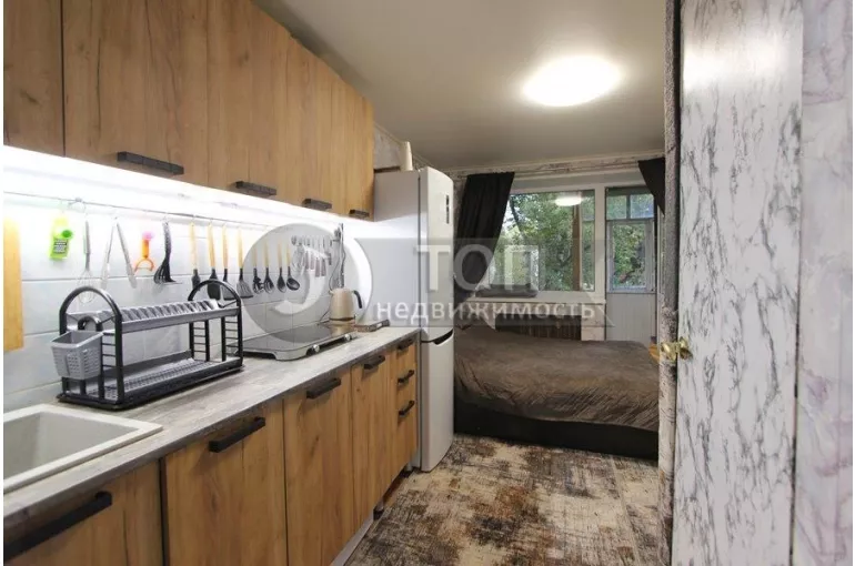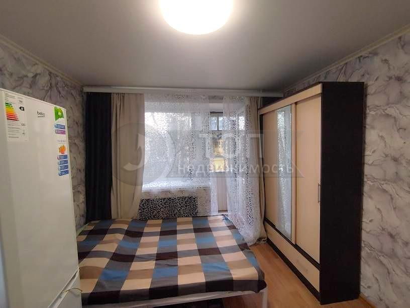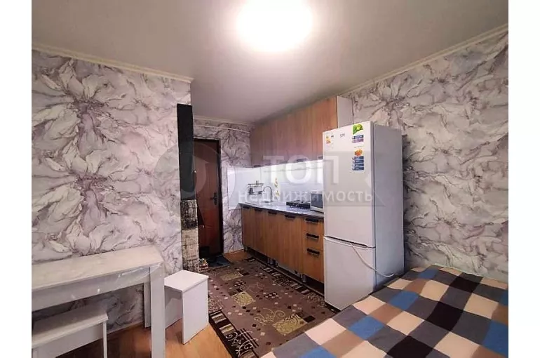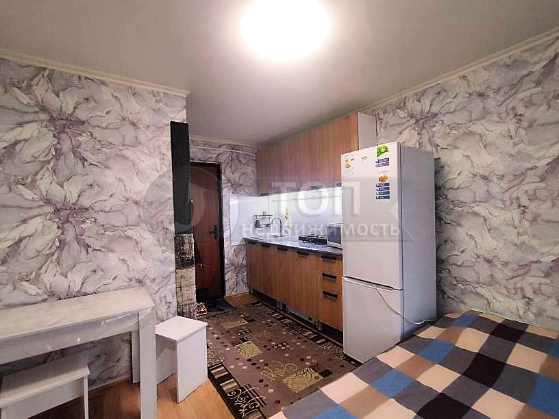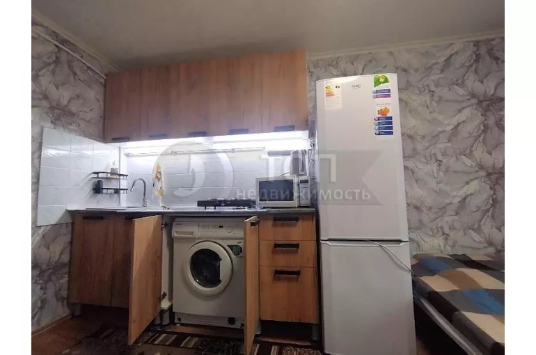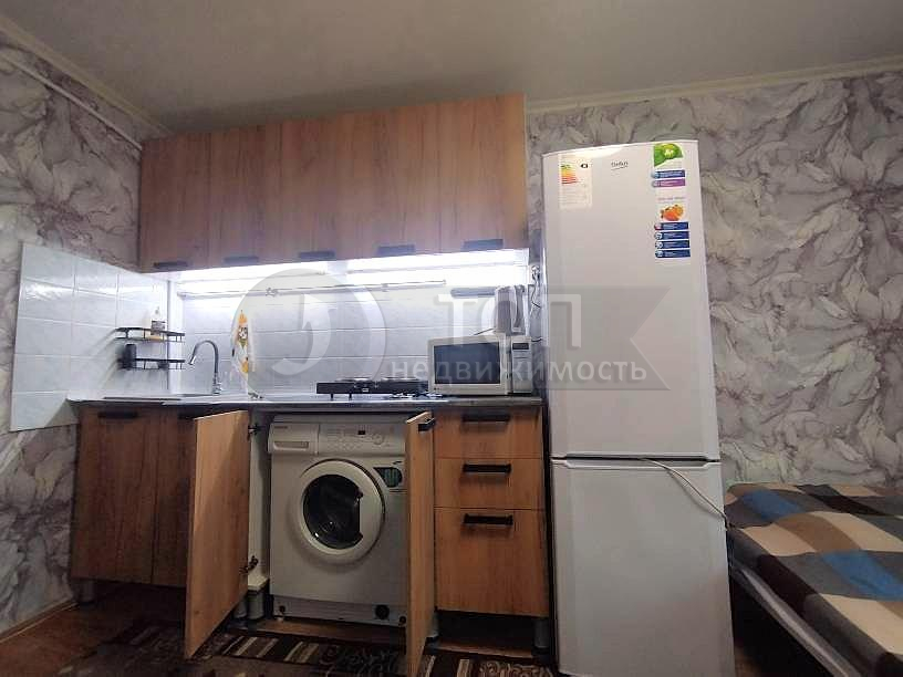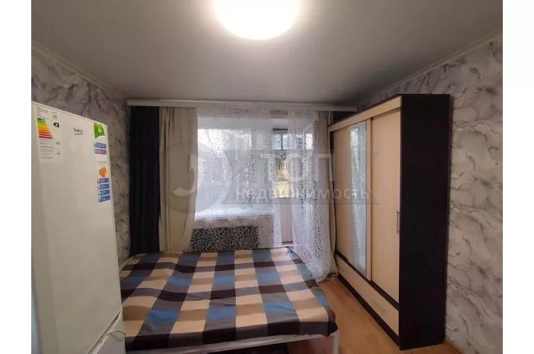В комнате есть спальное место – двуспальная кровать с новым ортопедическим матрасом, трехстворчатый шкаф-купе, обеденный стол с табуретами, а как же холодильник, стиральная машина, бойлер, СВЧ!