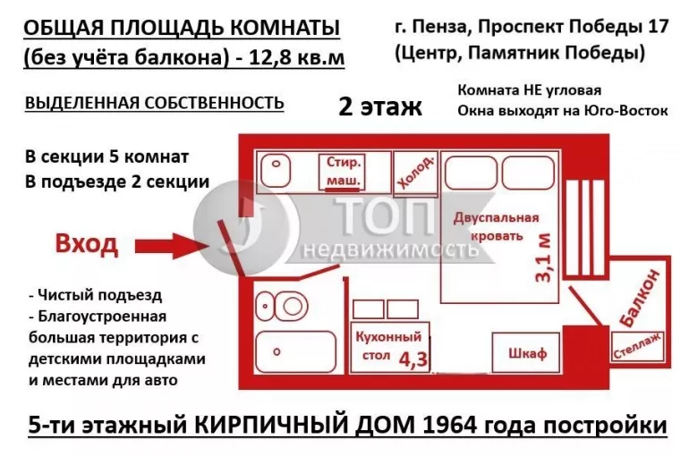 Комната расположена на комфортном 2-м этаже 5-ти этажного кирпичного дома 1964года постройки по адресу Проспект Победы, д. 17.