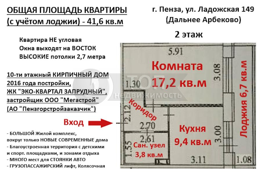 ОБЩАЯ ПЛОЩАДЬ КВАРТИРЫ (с учётом лоджии): 41,6 кв.м (комната 17,2 кв.м, кухня 9,3 кв.м, коридор 4,6 кв.м, сан. узел совмещенный 3,8 кв.м, лоджия 6,7 кв.м).