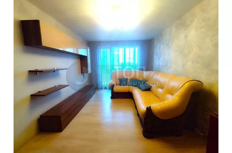 В гостиной расположен угловой диван обитый натуральной кожей, кроме того комната оснащена современной системой хранения. Из гостиной есть выход на застекленный уютный балкон.