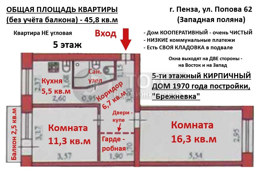 ОБЩАЯ ПЛОЩАДЬ КВАРТИРЫ (без учёта балкона): 45,8 кв.м (две изолированные комнаты 16,3 + 11,3 кв.м, кухня 5,5 кв.м, коридор 6,7 кв.м, гардеробная 3,2 кв.м, сан. узел совмещённый 2,8 кв.м) + балкон 2,5 кв.м.
