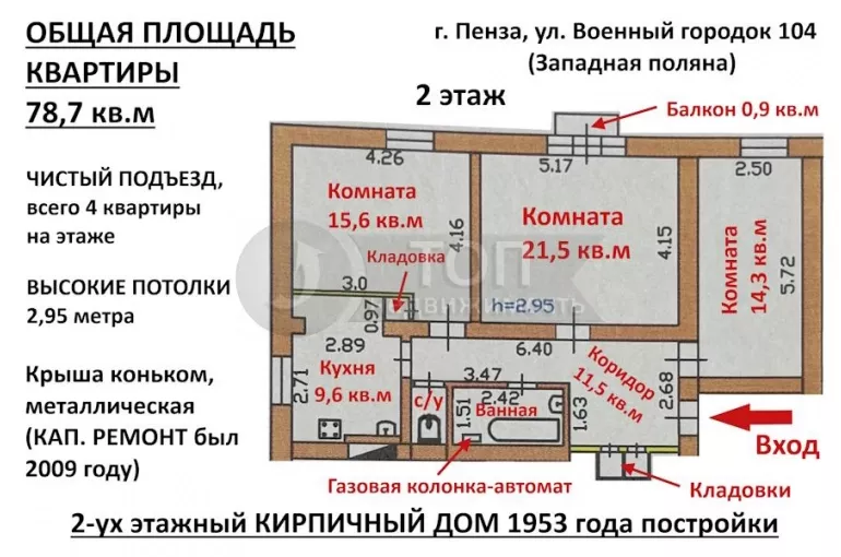 КРЕПКИЙ КИРПИЧНЫЙ ДОМ СТАЛИНСКОЙ постройки! На этаже всего 4 квартиры, в доме 8 квартир! ЧИСТЫЙ подъезд! КРЫША коньком, металлическая (НЕ течёт, КАП. РЕМОНТ был в 2009 году). ВЫСОКИЕ потолки – 2,95 метра! Горячая вода через газовую колонку – выходит ГОРАЗДО ДЕШЕВЛЕ, чем без колонки, и горячая вода ЕСТЬ ВСЕГДА!